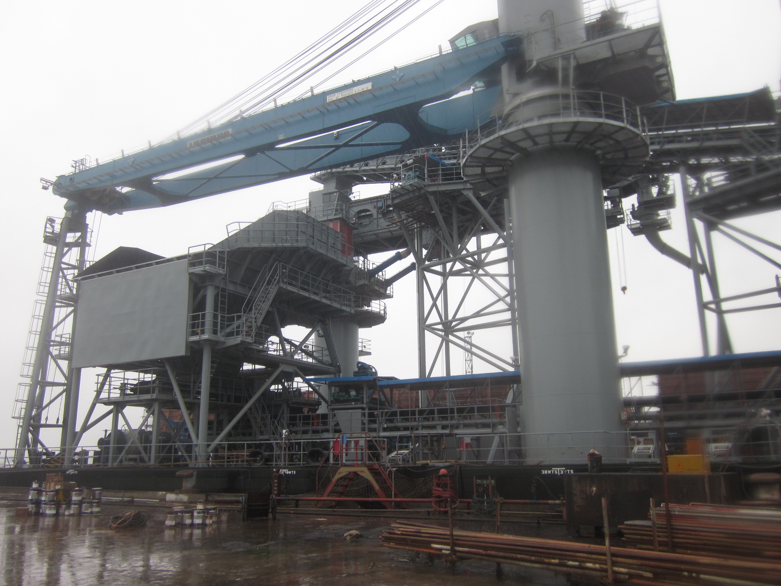 設計船體長寬分別為110米和28米,海面船體縱傾上限2°、橫傾上限5°,工作風速20m/s,非工作風速55m/s,輸送能力為3000~3500t/h。 我公司中標其中裝船機至卸船機之間的帶式輸送機及其桁架部分總體設計、制造及安裝調試。