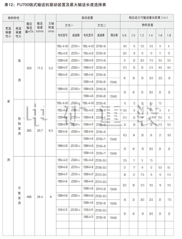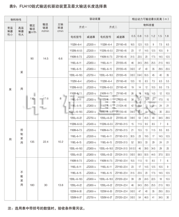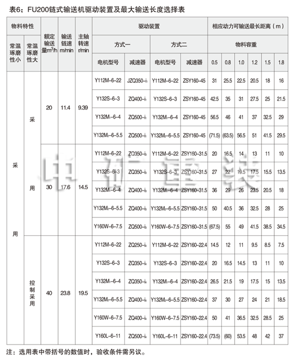 選定機型后,可根據輸送量,輸送長度和工藝布置狀況(參照表5 -12)選擇動力和減速機速比及 裝配型式。